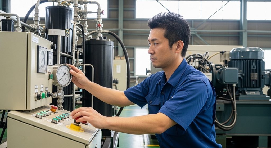 その結果、突然の油漏れや破損といった重大トラブルにつながることも少なくありません。設定圧は「動けば良い」ではなく、余裕を持たせることが重要です。少し圧を下げるだけで、寿命と安全性は大きく向上します。